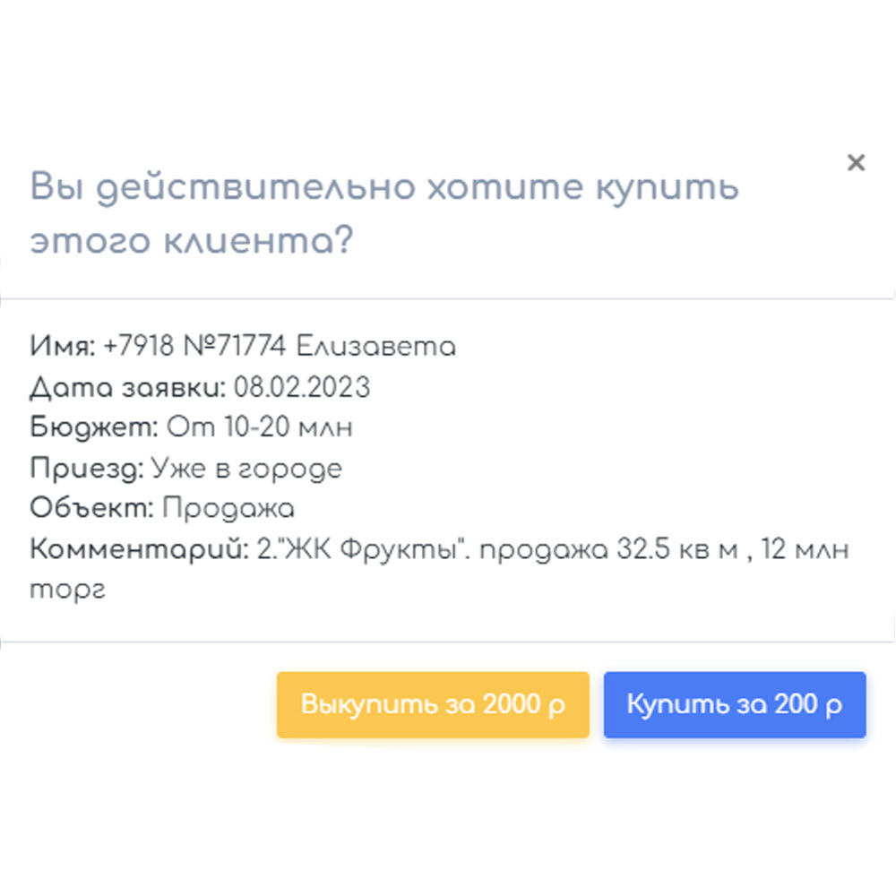 Наш колл центр прозванивает клиента, выявляет потребность: какой объект интересует, срок покупки, какой бюджет и способ оплаты. Перед покупкой вы будете иметь возможность прослушать запись разговора с клиентом. А за некачественно клиента получать автовозвраты!